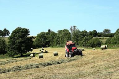 Keywords: field landscape nature fields grass sky curves tractor blue hay haying