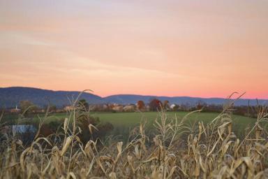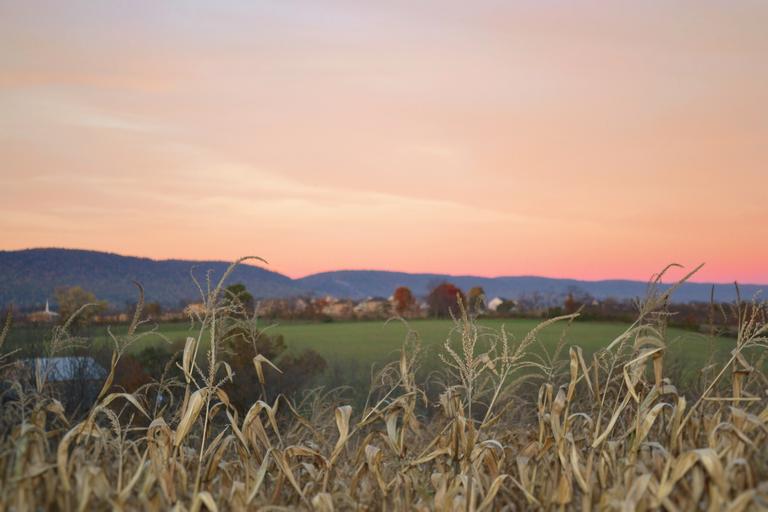Keywords: field meadow farmland village hills sunset town colors sky orange scenic tranquil peaceful quiet agricultural growth crops corn rural