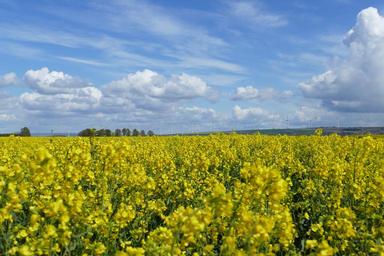Keywords: field of rapeseeds clouds sky yellow blue beautiful landscape oilseed rape rape blossom crop rapeseed oil sunbeam