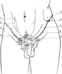 | Keywords: Fig24aDasRumpfende eines stehendenMannes.png Fig 24a Das Rumpfende eines stehenden Mannes von vorn mit Bauchlinie Leistinie und Schenkelbeugungsfurche Siehe Fig 24b KOLLMANNs Plastische Anatomie page 44 1910 Anschütz PD Image Fig24bRumpf_von_vornNach_einerPhotographie png PD-old 1 Rectus; 2 Seitenfurche; 3 Aponeurose; 4 Samenstang; 5 Muskelecke; 6 Spina; 7 Untere Bauchlinie; 8 Leistenlinie; 9 Schenkelbeugungsfurche Flaccid human penis in art Kollmann - Plastische Anatomie Diagrams labelled with numbers only |