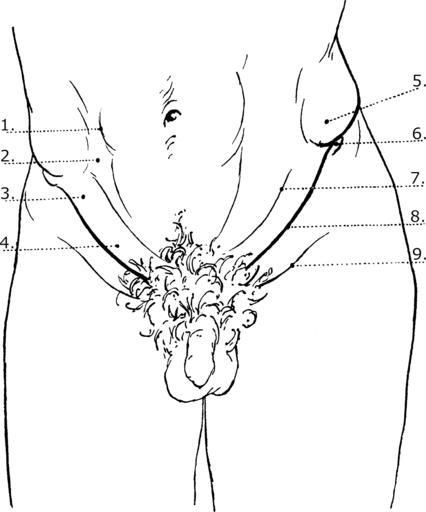 Keywords: Fig24aDasRumpfende eines stehendenMannes.png Fig 24a Das Rumpfende eines stehenden Mannes von vorn mit Bauchlinie Leistinie und Schenkelbeugungsfurche Siehe Fig 24b KOLLMANNs Plastische Anatomie page 44 1910 Anschütz PD Image Fig24bRumpf_von_vornNach_einerPhotographie png PD-old 1 Rectus; 2 Seitenfurche; 3 Aponeurose; 4 Samenstang; 5 Muskelecke; 6 Spina; 7 Untere Bauchlinie; 8 Leistenlinie; 9 Schenkelbeugungsfurche Flaccid human penis in art Kollmann - Plastische Anatomie Diagrams labelled with numbers only