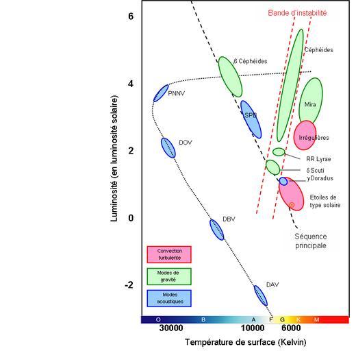 Keywords: Figure6.diagHR.png 6 Diagramme de Hertzsprung Russel HR des étoiles pulsantes Le diagramme HR représente les étoiles en fonction de 2 observables leur température de surface et leur luminosité La position des différents types connus d étoiles oscillantes y est illustrée Les couleurs représentent les différents types d oscillations attendus En bleu et vert c'est une perturbation du profil de l'opacité influençant le transfert de l énergie qui déclenche un mécanisme de piston mécanisme kappa excitant respectivement des modes acoustiques de gravité En rouge ce sont les mouvements turbulents de convection à la surface comme pour le Soleil Dans la bande d instabilité régions où les oscillations sont entretenues par le mécanisme kappa se situent les Céphéides et les RR Lyrae La ligne en tiret représente la séquence principale SP la phase durant laquelle les étoiles consomment l'hydrogène de leur noyau le transformant en hélium Les étoiles y sont dans un état stable et leur structure change à cause de la lente modification de leur composition chimique Les étoiles passent ainsi la plus grande partie de leur vie sur la séquence principale En dehors de celle-ci les étoiles sont au début ou à la fin de leur vie Sur et près de la SP du plus froid au plus chaud on trouve les pulsateurs de type solaire Doradus Scuti SPB et Céphéides La région des Mira correspond à la branche des géantes rouges La ligne pointillée représente l évolution des naines blanches lors de leur refroidissement classés en fonction de leur type spectral O B A D après Christensen-Dalsgaard 2006-12-31 own assumed Pascal57 Hertzsprung-Russell diagram |