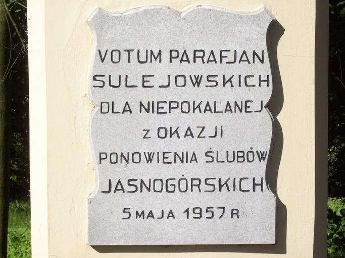 | Keywords: Figurka Matki Boskiej (Tablica) by Ron.jpg pl Tablica na Kapliczce Matki Boskiej Niepokalanej w Sulejowie Napis Votum Parafjan Sulejowskich dla Niepokalanej z okazji ponowienia ślubów Jasnogórskich 5 maja 1957 rok own Ron whisky 2008-08-22 Plaques in Sulejów Wayside shrines in Sulejów |
