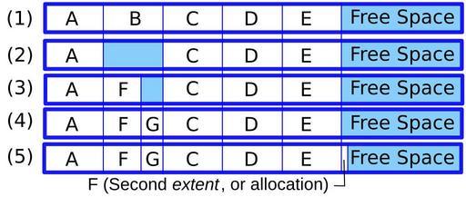 | Keywords: File system fragmentation.svg Example of how file systems become fragmented The following is from the article of the same name on Wikipedia A blank disk has 5 files A B C D and E each using 10 blocks of space for this section a block is an allocation unit of that system it could be 1K 100K or 1 megabyte and is not any specific size On a blank disk all of these files will be allocated one after the other Example 1 on the image If file B is deleted there are two options leave the space for B empty and use it again later or compress all the files after B so that the empty space follows it This could be time consuming if there were hundreds or thousands of files which needed to be moved so in general the empty space is simply left there marked in a table as available for later use then used again as needed Example 2 on the image Now if a new file F is allocated 7 blocks of space it can be placed into the first 7 blocks of the space formerly holding the file B and the 3 blocks following it will remain available Example 3 on the image If another new file G is added and needs only three blocks it could then occupy the space after F and before C Example 4 on the image Now if subsequently F needs to be expanded since the space immediately following it is no longer available there are two options 1 add a new block somewhere else and indicate that F has a second extent or 2 move the file F to someplace else where it can be created as one contiguous file of the new larger size The latter operation may not be possible as the file may be larger than any one contiguous space available or the file conceivably could be so large the operation would take an undesirably long period of time thus the usual practice is simply to create an extent somewhere else and chain the new extent onto the old one Example 5 on the image Repeat this practice hundreds or thousands of times and eventually the file system has many free segments in many places and many files may be spread over many extents If as a result of free space fragmentation a newly created file or a file which has been extended has to be placed in a large number of extents access time for that file or for all files may become excessively long Rfc1394 File systems Megabyte |
