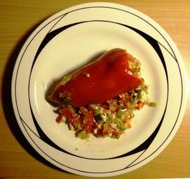 | Keywords: Filled-pepper.jpg en Pepper filled with tomatos cheese onion and garlic de Paprika gefüllt mit Tomaten Schafskäse Lauchzwiebel und Knoblauch own MartinThoma 2015-10-30 Pepper Dinners Taken with Panasonic Lumix DMC-TZ41 Images by Martin Thoma/Food Cc-zero |