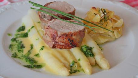 Keywords: fillet pig asparagus potatoes potato gratin eat food bacon hunger edible chives colorful tasty fry barbecue cook