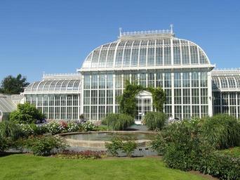 Keywords: finland botanical garden building glass hothouse architecture nature outside plants grass sky clouds summer spring