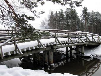 Keywords: finland bridge stream river water architecture winter snow ice sky clouds forest trees woods nature outside country countryside
