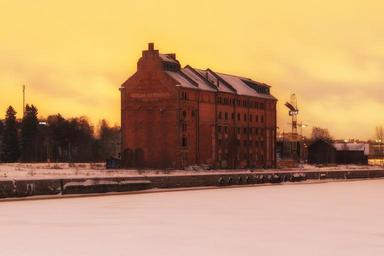 Keywords: finland building old canal water river sky clouds sunset winter snow ice nature outside warehouse