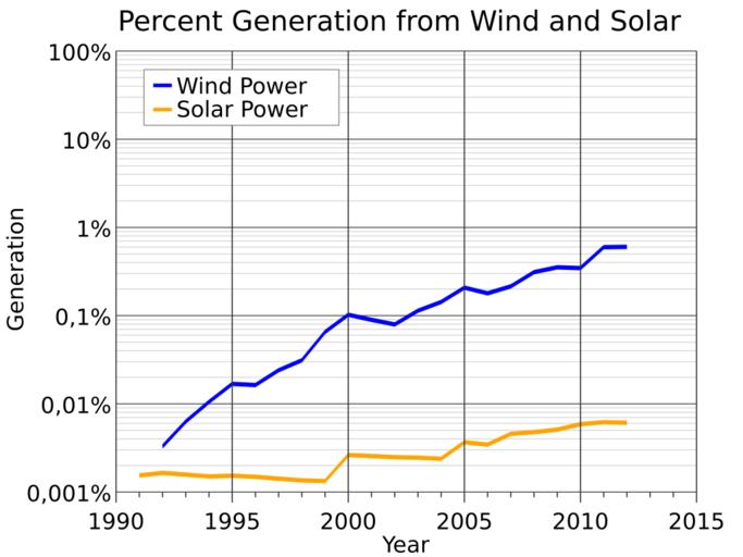 | Keywords: Finland Wind and Solar Generation Percentage-semilog.svg translate yes en Finland wind and solar generation as a percentage of consumption semilog plot Constant percentage growth plots as a straight line on a semilog plot Data from http //www eia gov/cfapps/ipdbproject/iedindex3 cfm tid 6 pid 116 aid 12 cid regions syid 1991 eyid 2012 unit BKWH US EIA 2016-05-06 own Delphi234 other versions cc-zero Wind power in Finland Solar energy in Finland | ||||