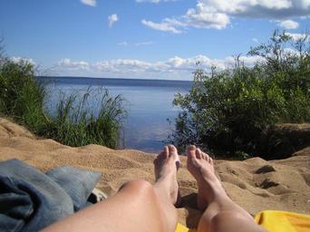 Keywords: finnish man summer vacation landscape photo in oulu lake beach water nature lake in finland blue sky sunshine landscape horizon shoreline the lower legs toes