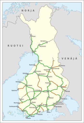 | Keywords: Finnish railroad network-fi.svg en The railway network of Finland a map in Finnish 00a700 Matkustaja- ja tavaraliikennettä outline color css border c75000 Vain tavaraliikennettä outline color css border 9f9f9f Lakkautettu outline color css border 3300c7 Porvoon museorautatie outline color css border Tehty Inkscapessa Pohjakartta perustuu CIA n karttaan vuodelta 1996 File Finland 1996 CIA map jpg Radat ovat CIA n kartasta Niitä on päivitetty RHK n rataverkkokartasta v lta 2010 http //www rhk fi/radan_kaytto/verkkoselostus/verkkoselostus_2010/3_rataverkko/ Jaottelu matkustaja- ja tavaraliikenteeseen perustuu VR n kaukoliikenteen reittikarttaan http //www vr fi/fin/ohjeet/matkahakuohjeet/reittikartta shtml Mysid 2010-06-24 100px thumb left English inkscape SVG maps in Finnish SVG rail transport maps of Finland |