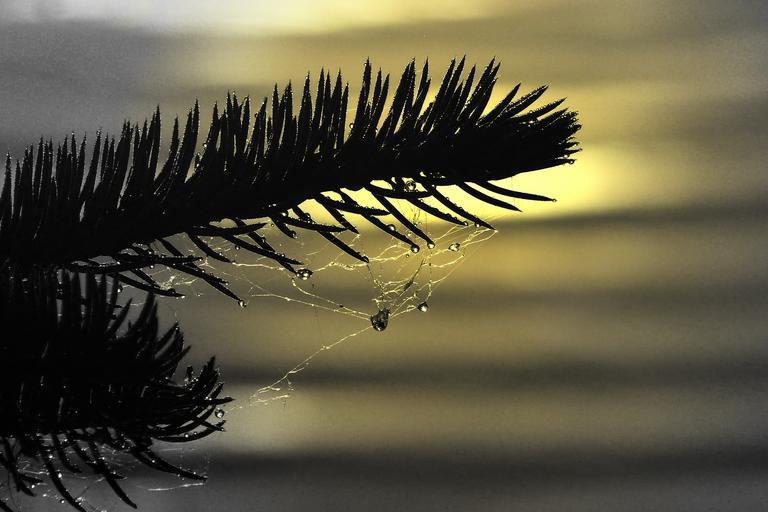 Keywords: fir branch spider web rain drops sun set close-up nature weather atmosphere