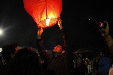 Keywords: fire lantern dark night people crowd spectators photographers man guy