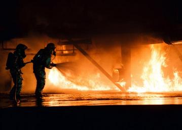 Keywords: firefighter training simulated plane fire flames hot heat dangerous equipment protection helmet gear