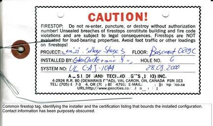 | Keywords: Firestop tag front.jpg Firestop tag front identifying installer location and certification listing that bounds the installed configuration This tag was printed on Tyvek for durability It has an eyelet and a stainless steel wire for securing onto the firestop or a penetrant Own 2007-06-24 Achim Hering Firestop tags caution Tyvek |