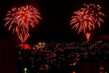 Keywords: fireworks firecrackers lights lighting bursting ignites celebrations festival new year bright glowing golden yellow sparkling sparkles cities city fun party festive display