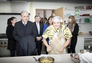 | Keywords: groupshot people indoor La firma de convenio entre UMAG y la Corporación Manos de Hermanos se realizó el día Martes 7 de Abril de 2015 en el Centro Laboral de la Corporación ubicado en la Calle Cirujano Videla # 34. El objetivo de este convenio es que los alumnos de UMAG puedan realizar prácticas profesionales en este centro laboral. La corporación Manos de Hermanos acoge a adultos con capacidades diferentes entre 26 y 50 años, les entrega herramientas para su autonomía, en el ámbito de creatividad artística, mejora de la motricidad, cocina y aseo. Manos de Hermanos es una corporación privada sin fines de lucro, que se financia mediante proyectos del gobierno regional, además de aportes voluntarios de privados. En la Foto (de izq a der): Dr. Juan Oyarzo (Rector UMAG) junto a autoridades de UMAG visitan Taller de Cocina La firma de convenio entre UMAG y la Corporación Manos de Hermanos se realizó el día Martes 7 de Abril de 2015 en el Centro Laboral de la Corporación ubicado en la Calle Cirujano Videla # 34. El objetivo de este convenio es que los alumnos de UMAG puedan realizar prácticas profesionales en este centro laboral. La corporación Manos de Hermanos acoge a adultos con capacidades diferentes entre 26 y 50 años, les entrega herramientas para su autonomía, en el ámbito de creatividad artística, mejora de la motricidad, cocina y aseo. Manos de Hermanos es una corporación privada sin fines de lucro, que se financia mediante proyectos del gobierno regional, además de aportes voluntarios de privados. En la Foto (de izq a der): Dr. Juan Oyarzo (Rector UMAG) junto a autoridades de UMAG visitan Taller de Cocina |