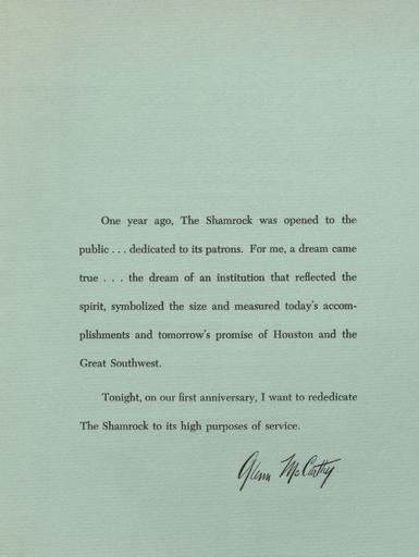Keywords: First Anniversary Saint Patrick's Day celebration - message from Glen McCarthy.jpg en Shamrock Hotel Houston Texas First Anniversary Saint Patrick's Day Celebration message from Glen McCarthy 1950 The University of Houston Digital Library http //digital lib uh edu The University of Houston Digital Library Custom license marker 2012 04 29 This image is in the public domain and may be used freely If publishing in print electronically or on a website please use the citation Courtesy of Special Collections University of Houston Libraries To order a higher resolution reproduction see http //info lib uh edu/about/campus-libraries-collections/special-collections-archives/request-digital University of Houston Libraries Uploaded with UploadWizard 1950 documents Saint Patrick's Day in the United States Hotels in Houston Food menus 1950 in Houston |