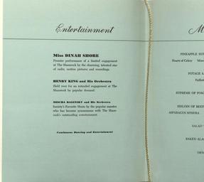 | Keywords: First Anniversary Saint Patrick's Day celebration - Entertainment and menu.jpg en Shamrock Hotel Houston Texas First Anniversary Saint Patrick's Day Celebration Entertainment - Dinah Shore 1950 The University of Houston Digital Library http //digital lib uh edu The University of Houston Digital Library Custom license marker 2012 04 29 This image is in the public domain and may be used freely If publishing in print electronically or on a website please use the citation Courtesy of Special Collections University of Houston Libraries To order a higher resolution reproduction see http //info lib uh edu/about/campus-libraries-collections/special-collections-archives/request-digital University of Houston Libraries Uploaded with UploadWizard 1950 documents Saint Patrick's Day in the United States Hotels in Houston Food menus 1950 in Houston |