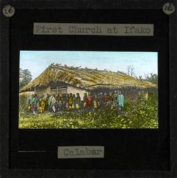 | Keywords: "First Church at Ifako, Calabar", late 19th century (imp-cswc-GB-237-CSWC47-LS2-026).jpg en <br> First Church at Ifako Calabar late 19th century Group picture of Ifako villagers grouped outside the first church to be built there The church has a thatched roof and plaster walls ; Ifako is located in later day Nigeria The first Okoyong church was built at Ifako and was designed by Mary Slessor The chiefs promised that this church would be a sanctuary of refuge and that no weapon would be carried into it Photographer Unknown Filename imp-cswc-GB-237-CSWC47-LS2-026 tif Coverage date circa 1880 Part of collection International Mission Photography Archive ca 1860-ca 1960 Type images Part of subcollection Photographs from the Centre for the Study of World Christianity University of Edinburgh U K ca 1900-ca 1940s Repository name Centre for the Study of World Christianity Archival file impaunpub_Volume7/1299 url Repository address The University of Edinburgh School of Divinity New College Mound Place Edinburgh EH1 2LX United Kingdom Geographic subject country Nigeria Format aacr2 1 lantern slide 8 x 8 cm Geographic subject continent Africa Rights Contact the repository for details Part of series Mary Slessor LS2 Repository email divinity-CSWC ed ac uk Subject lcsh Keyword Village communities; Church buildings Date created circa 1880 Publisher of the digital version University of Southern California Libraries Subject aat genre group portraits Format aat lantern slides Legacy record ID impa-m68169 Access conditions http //www ed ac uk/schools-departments/divinity/research/centres/world-christianity/collections-resources File GB 237 CSWC47/LS2/26 1880 author http //digitallibrary usc edu/cdm/ref/collection/p15799coll123/id/64422 PD-old-70-1923 Magic lantern images Images from USC Digital Library uploaded by Fæ International Mission Photography Archive ca 1860-ca 1960 Calabar |