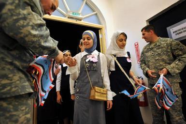 | Keywords: First-ever video conference between Iraqi, U.S. children DVIDS129021.jpg en Iraqi children enter the Moral Welfare and Recreation building receiving Iraqi flags from U S Soldiers during their visit to Forward Operating Base Falcon Iraq that hosted the first ever video teleconference between Iraqi students and American students on Nov 12 Students from Nolanville Elementary outside of Fort Hood Army Base Texas interact with Iraqi students of Al Khartoon Elementary located in the Doura community of southern Baghdad The students asked each other various questions building relations between their two cultures 2008-11-12 Petty Officer 2nd Class Todd Frantom https //www dvidshub net/image/129021 081112-N-+++++-502 2008-11-17 00 13 FORWARD OPERATING BASE FALCON IQ PD-USGov-Military-Navy Forward Operating Base Falcon Images from DoD uploaded by Fæ |