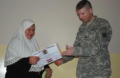 | Keywords: First female Security Volunteers graduate in Adhamiyah DVIDS61545.jpg en Fort Knox Kentucky-native Lt Col Jeff Broadwater commander of the U S Army's 3rd Squadron 7th Cavalry Regiment presents a certificate to a graduating member of the first class of female Iraqi security volunteers in Baghdad's Adhamiyah neighborhood during a graduation ceremony Oct 12 After completing training organized by the 3-7 Cavalry the women will join hundreds of male residents who are already on duty protecting public places such as schools hospitals and government buildings against terrorists 2007-10-15 Staff Sgt Michael Pryor https //www dvidshub net/image/61545 61545 2007-10-15 08 10 BAGHDAD IQ PD-USGov Fort Knox Images from DoD uploaded by Fæ |