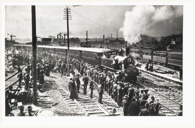 | Keywords: archives state records nsw staterecordsnsw newsouthwales blackandwhite rail train steam train steamtrain central station 1906 opening photo border black and white Title: First train leaving new (third) Sydney Station 1906 Dated: 31/12/1906 Digital ID: 17420_a014_a014001396 Series: NRS 17420 State Rail Authority Archives Photographic Reference Print Collection Rights: No known copyright restrictions www.records.nsw.gov.au/about-us/rights-and-permissions We'd love to hear from you if you use our photos/documents. Many other photos in our collection are available to view and browse on our website using Photo Investigator. Title: First train leaving new (third) Sydney Station 1906 Dated: 31/12/1906 Digital ID: 17420_a014_a014001396 Series: NRS 17420 State Rail Authority Archives Photographic Reference Print Collection Rights: No known copyright restrictions www.records.nsw.gov.au/about-us/rights-and-permissions We'd love to hear from you if you use our photos/documents. Many other photos in our collection are available to view and browse on our website using Photo Investigator. |