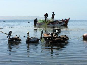 Keywords: fischer fish fishing boat peru paracas sea pelicans water animal boot