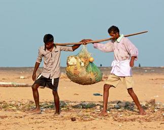 Keywords: fishermen nets ocean fishing net equipment carrying labor india sea