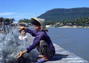 Keywords: Fishignet.jpg Mother and daughter cleaning a fishing net on a long pier in front of Ham Ninh village in Phu Quoc Vietnam December 2002 2007-03-12 own assumed Plicata Women of Vietnam Fishing in Vietnam Phu Quoc Nón lá
