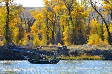 Keywords: fishing boat autumn fall leaves colorful trees water river sport recreation nature leisure fisherman fun rod outdoors rowing