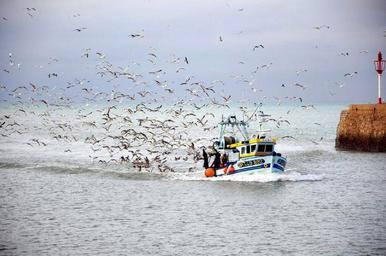 Keywords: fishing boat birds seagulls water ocean sky sea landscape seascape nautical le havre france vessel horizon port marine