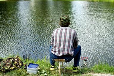 Keywords: fishing the fisherman male sitting sit green fish hunting rod pond lagoon lake water reservoir