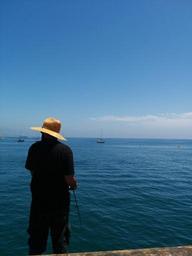 Keywords: fishing fisherman water rod ocean pier dock nature recreation solitude hat yellow hat reel salt water vacation casting