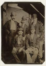 | Keywords: Five Members of the Wild Bunch.jpg The Wild Bunch was the largest and most notorious band of outlaws in the American West Led by two gunmen better known by their aliases Butch Cassidy Robert LeRoy Parker and Kid Curry Harvey Logan the Wild Bunch was an informal trust of thieves and rustlers that preyed upon stagecoaches small banks and especially railroads from the late 1880s to the first decade of the twentieth century This crudely constructed tintype portrait of five members of the gang dressed in bowler hats and city clothes shows clockwise from the top left Kid Curry Bill McCarty Bill Tod Carver Ben Kilpatrick and Tom O'Day Without their six shooters and cowboy hats the outlaws appear quite civilized and could easily be mistaken for the sheriffs and Pinkerton agents who pursued them in a Wild West already much tamed by the probable date of this photograph Gone was the open range--instead homesteads and farms dotted the landscape and barbed-wire fences frustrated the cattleman's drive to market Gone too was the anonymity associated with distance as the camera and the telegraph conspired to identify criminals Bank and train robbery were still lucrative but the outlaw's chances for escape gradually shifted in favor of the sheriff's chances for arrest and conviction By 1903 the Wild Bunch had disbanded A few members of the gang followed Butch Cassidy to South America while the majority remained in the West trying to avoid capture McCarty was shot dead in 1893 in a street in Delta Colorado after a bank robbery; Carver died in prison; Kilpatrick was killed during a train robbery in 1912; Tom O'Day was captured by a Casper Wyoming sheriff in 1903; and Kid Curry died either by his own hand in Parachute Colorado in 1904 or as legend has it lived until he was killed by a wild mule in South America in 1909 The photograph comes from the collection of Camillus S Fly a pioneer photographer in Tombstone Arizona in the 1880s and sheriff of Cochise County in the 1890s ~ 1892 http //www metmuseum org/Collections/search-the-collections/190036419 rpp 20 pg 1 ft band+of+bunch pos 1 Unknown Artist PD-Art Uploaded with UploadWizard Wild Bunch |