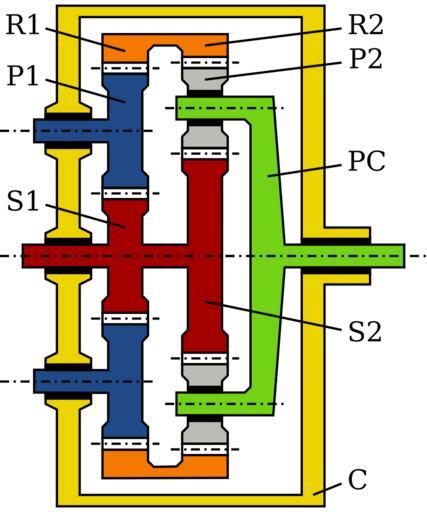 | Keywords: Fixed Diff D.svg A fixed differential gear system This arrangement has a typical ratio of between 15 1 and 100 1 The ratio is given by <math>m_G \frac 1 \frac 1 \left \frac N_ R2 N_ S2 +1\right - \frac 1 \frac N_ R1 N_ S1 \left \frac N_ S2 N_ R2 +1 \right </math> where <math>N_ S1 </math> is the number of teeth on the No 1 Sun gear S1 red on the left <math>N_ S1 </math> is the number of teeth on the No 2 Sun gear S1 red on the right <math>N_ R1 </math> is the number of teeth on the No 1 Ring gear R1 orange on the left <math>N_ R2 </math> is the number of teeth on the No 2 Ring gear R2 orange on the rightn <math>N_ P1 </math> is the number of teeth on the No 1 Planet gear P1 dark blue These gears rotate about fixed axes <math>N_ S2 </math> is the number of teeth on the No 2 Planet gear P2 grey The fixed member is the cage C yellow the input member is the No 1 Sun and the output member is the Planet Carrier PC green self-made Inkscape 2008-03-18 Inductiveload Differential gear systems Drawings of gears and gearboxes Planetary gearing Transmissions SVG machinery |