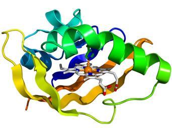 Keywords: FixL 1y28.png Crystallographic structure of the PAS domain of the bacterial oxygen sensor protein fixL <ref name pmid12820879 > 1y28 ; cite journal Dunham CM Dioum EM Tuckerman JR Gonzalez G Scott WG Gilles-Gonzalez MA A distal arginine in oxygen-sensing heme-PAS domains is essential to ligand binding signal transduction and structure Biochemistry 42 25 7701 “8 2003 July 12820879 10 1021/bi0343370 </ref> The protein is depicted as a rainbow colored cartoon N-terminus blue C-terminus red while the heme ligand is shown as sticks carbon white nitrogen blue oxygen red iron orange Own 2009-02-03 Boghog2 Ribbon diagrams