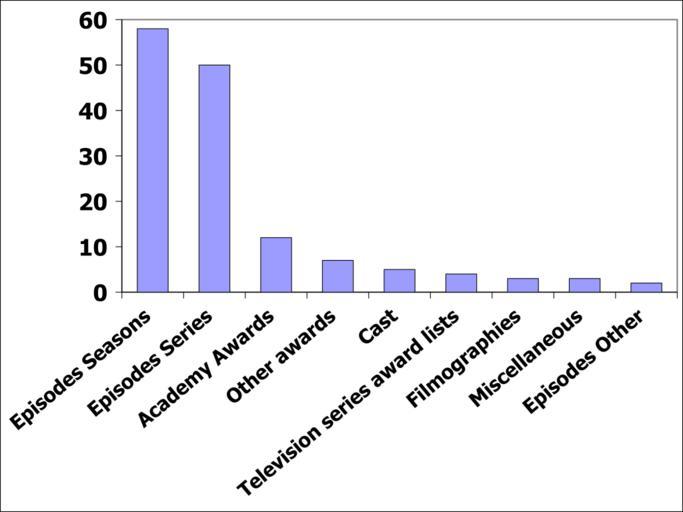Keywords: FL Media barchart 2008-11-30.svg Wikipedia Featured Lists for Media as listed in the Arts/Media section on w Wikipedia Featured lists FLs on 2008-11-30 13 22 UTC Left hand vertical scale is number of FLs in each Media subsection and horizontal scale lists the subsections in order of membership There are 144 FL Media lists Data is from http //en wikipedia org/w/index php title Wikipedia Featured_lists oldid 254854023 retrieved on 2008-11-30 15 30 UTC Gnumeric 1 9 1 was used to create this chart 2008-11-30 84user See also thumb left Featured articles ordered by number in section clr Data used to create this in CSV format - click on the triangle to the right Academy Awards 12 Television series award lists 4 Other awards 7 Cast 5 Episodes Series 50 Episodes Seasons 58 Episodes Other 2 Filmographies 3 Miscellaneous 3 Instructions explaining how to recreate this chart - click on the triangle to the right Copy the the data above excluding the blank and total lines and paste directly into a Gnumeric spreadsheet Alternatively paste the data into a Star Office spreadsheet but these instructions assume you are using Gnumeric Gnumeric will display a Text import configuration dialog Click Forward in that dialog and check the data is correctly ordered into two columns If the data is not correctly ordered choose suitable separators as necessary If you copied the data badly or have messy data you may need to edit first before copying and pasting click Forward again Click Finish and Gnumerix should show the data in the sèreadsheet Click the Bar chart icon at the right of the icon bar and get the Step 1 of 2 Select Chart Type dialog Click the Column Plot type Click Forward on the dialog Click Insert and choose a location on the spreadsheet expand the chart to a suitable size The chart should now appear with the column 1 data on the horizontal scale and the column 2 data in the form of bars Right-click over the chart and select Properties to get the Customise Chart dialog Modify add or remove whatever you want to get the appearance you want Click Apply when done To get different sort orders select the two columns and click Data/Sort To save the chart as a SVG file right click on the chart and select Save As Image and choose SVG File type Repeat with different data different chart types different sort orders and so on Created with Gnumeric SVG statistics Wikipedia statistics English Wikipedia statistics