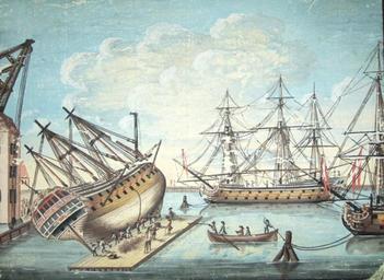 | Keywords: Flådens Leje af Rønneby.jpg da Scene fra Flådens Leje ved Nyholm Et 50-kanoners-skib er krænget over ved Bradbænken under Mastekranen Arbejdere fra Holmens Faste Stok er fra en pram i færd med at foretage reparationer under skibets vandlinje I baggrunden et andet skib med samme antal kanoner muligvis er det orlogsskibene FYEN og NELDEBLADET begge løbet af stabelen 1746 http //www orlogsmuseet dk/sch/pro_bil1 htm Clemens Mogensen Clemensen Rønneby 1727-1815 s 1750 File Nyholm careening JPG 1750s paintings Clemens Mogensen Rønneby Holmen Careening Naval ships of Denmark 1700-1799 Media from the collections of The Danish National Museum of Military History PD-old-100 |