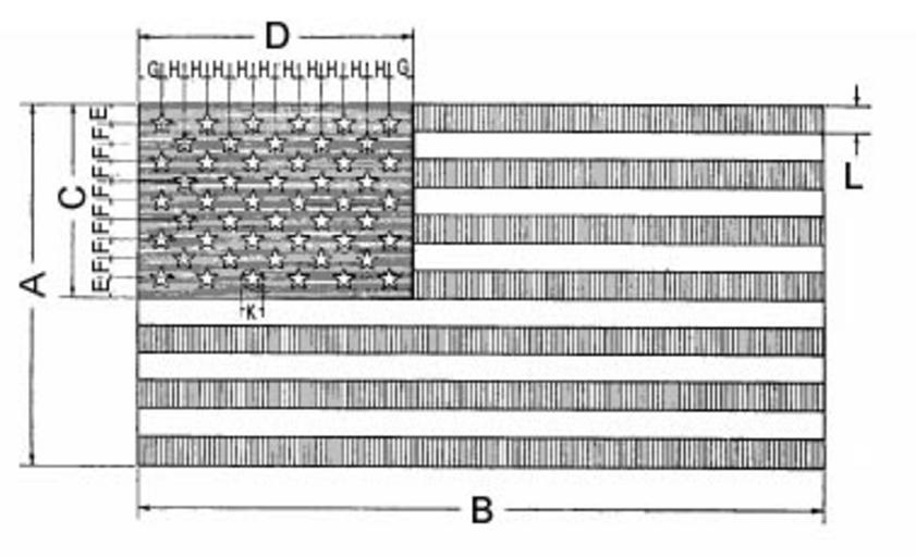 | Keywords: Flag of the United States specification.jpg This diagram of the flag of the United States was given in Executive Order 10834 by Dwight D Eisenhower on August 21 1959 see w List of United States federal executive orders It appears in the United States Code title 4 chapter 1 http //assembler law cornell edu/uscode/html/uscode04/usc_sec_04_00000001----000-notes html Text of executive order here For a better diagram of the flag see Image Flag of the United States specification svg The law specifies the lengths in the diagram as follows Hoist width of flag A 1 0 Fly length of flag B 1 9 Hoist width of Union C 0 5385 7/13 Fly length of Union D 0 76 E F 0 054 G H 0 063 Diameter of star K 0 0616 Width of stripe L 0 0769 1/13 Presumably E and F are supposed to be 7/130 0 0538461 and G and H are supposed to be 0 76/12 0 063 PD-USGov Flag construction sheets of the United States 1950s technical drawings Executive orders of the United States |