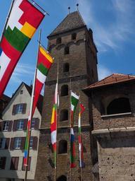 Keywords: flags colorful blow wind flutter danube fixed ulm metzgerturm