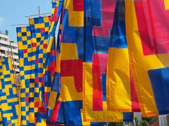 Keywords: flags colorful blow wind flutter blue red yellow danube fixed ulm