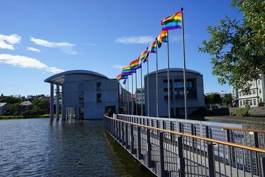 Keywords: flags town hall bridge reykjavik iceland