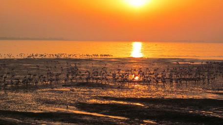 Keywords: flamingos beach sunrise landscape bird flock nature sea ocean outdoor wildlife