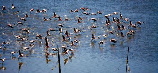 Keywords: flamingos flying lift off flock flocking animal environment fly flight taking off