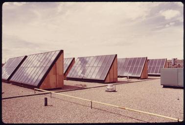 | Keywords: FLAT PLATE SOLAR HEATING COLLECTORS BUILT BY THE SOLARON CORPORATION, AND INSTALLED ON THE ROOF OF THE GUMP GLASS... - NARA - 557320.jpg Scope and content FLAT PLATE SOLAR HEATING COLLECTORS BUILT BY THE SOLARON CORPORATION AND INSTALLED ON THE ROOF OF THE GUMP GLASS COMPANY IN THAT CITY THE INSTALLATION IS ONE OF THE FIRST INDUSTRIAL USES OF SOLAR HEATING IN THE NATION THE HOT AIR COLLECTORS WILL PROVIDE HEATING FOR ABOUT 8 000 SQUARE FEET OF OFFICE SPACE A ROCK FILLED BIN PROVIDES STORAGE OF HEAT FOR EVENING AND BAD WEATHER USE THE STORAGE WILL PROVIDE FOR UP TO TWO CLOUDY DAYS OF HEAT BEFORE REQUIRING SUPPLEMENTARY HEAT FROM A CONVENTIONAL SOURCE General notes 557320 Local identifier 412-DA-14868 Environmental Protection Agency 12/02/1970 - NARA-Author Norton Boyd 1936- Photographer 1111093 <br /> Denver Denver county Colorado United States North and Central America inhabited place 4201265 39 733 -104 98 <br /> Still Picture Records Section Special Media Archives Services Division NWCS-S National Archives at College Park 8601 Adelphi Road College Park MD 20740-6001 05/1975 Record group Record Group 412 Records of the Environmental Protection Agency 1944 - 2006 Record group ARC 708 DOCUMERICA The Environmental Protection Agency's Program to Photographically Document Subjects of Environmental Concern compiled 1972 - 1977 Series ARC 542493 File unit File unit ARC Variant control numbers Agency-Assigned Identifier 248/48/014868<br /> NAIL Control Number NWDNS-412-DA-14868 Other versions <gallery> File FLAT_PLATE_SOLAR_HEATING_COLLECTORS_BUILT_BY_THE_SOLARON_CORPORATION _AND_INSTALLED_ON_THE_ROOF_OF_THE_GUMP_GLASS _-_NARA_-_557320 tif tif File FLAT_PLATE_SOLAR_HEATING_COLLECTORS_BUILT_BY_THE_SOLARON_CORPORATION _AND_INSTALLED_ON_THE_ROOF_OF_THE_GUMP_GLASS _-_NARA_-_557320 jpg jpg </gallery> NARA-cooperation PD-USGov Solar power in Colorado |