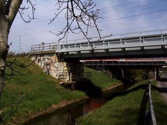 | Keywords: FlauschlenbridgeF0083.JPG de Brücken über die Panke in Berlin beim Bau des Berliner Eisenbahnaußenringes 1950er Jahren als durch die Westsektoren aus politischen und militärischen Erwägungen nicht der Nordsüdverkehr geführt werden sollte wurden zwei Brückenbauwerke errichtet die über die Krontaler Straße auf Blankenburger Flur und über die Panke führen Die dritte südliche der drei benachbarten Brücken führt von West nach Süd an die Stettiner Bahn heran und dient vor allem der S-Bahn-Linie S8 own Boonekamp 2010-04-20 Panke in Berlin-Blankenburg |