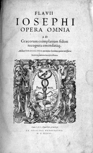 | Keywords: Flavius Josephus 1582 by Froben.jpg Flavius Josephus Opera omnia ad Graecorum exemplarium fidem recognita emendataque printed by the Froben workshop officina Frobeniana Basel 1582 http //www bassenge com/ 1582 Author PD-old-100 Flavius Josephus 1582 books Johannes Froben Title pages from Switzerland Images from Galerie Bassenge Title pages in Latin |