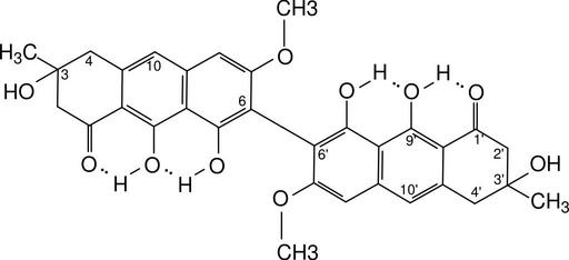 | Keywords: Flavomannin-6.6'-dimethylether-2.svg Structur of Flavomannin-6 6'-dimethylether a main pigment of some Dermocybe species like Cortinarius cinnamoneus own Created with Bkchem and Inkscape 2016-03-04 User Thkgk Cc-zero Anthraquinones Cortinarius pigments |